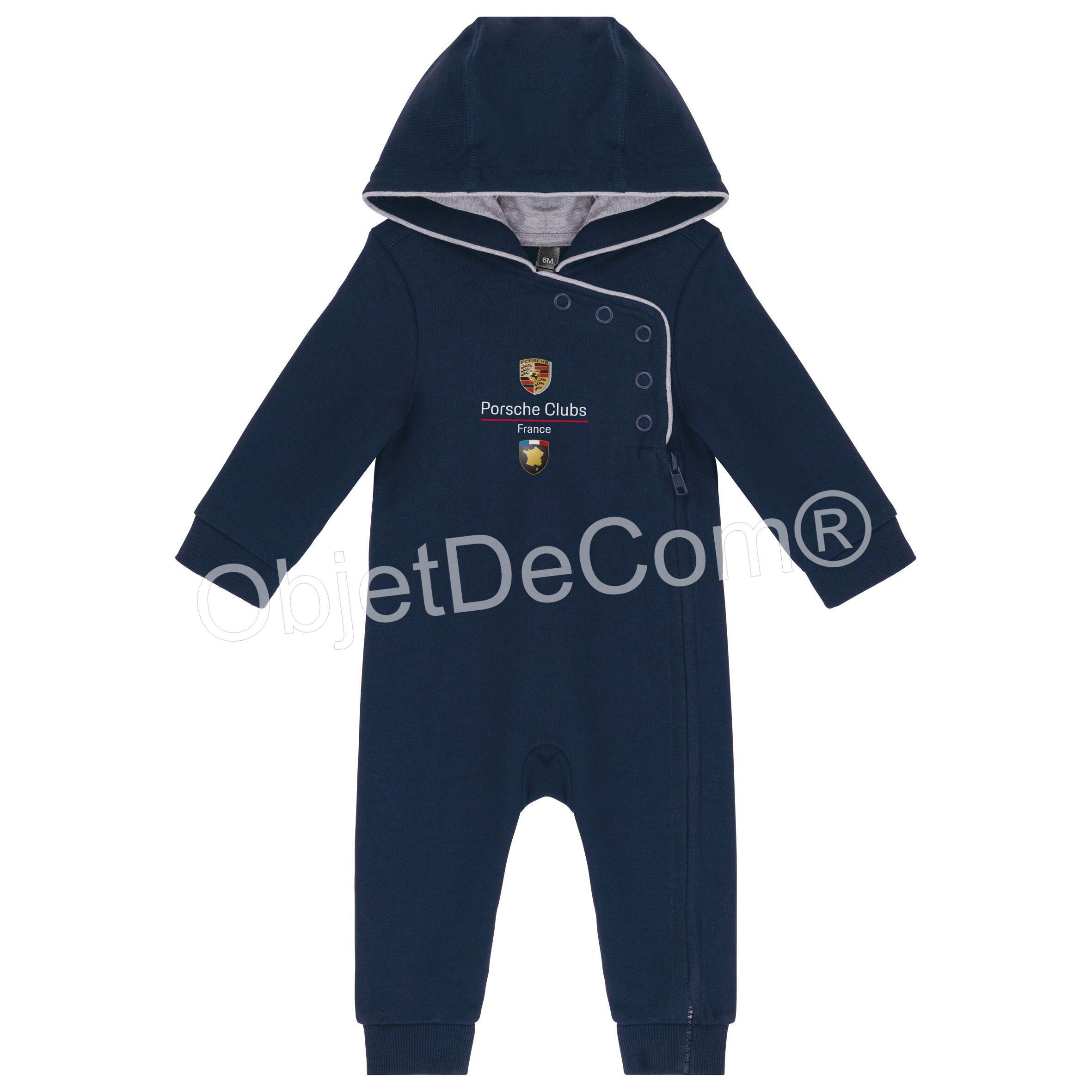 300 gr/m². 85% coton 15% viscose pour tissu Oxford Grey, 100% coton pour tissu Navy. Molleton non gratté. Ouverture sur le devant avec zip et boutons pression. Intérieur de capuche contrasté. Bas de manches et de jambes en bord-côte.