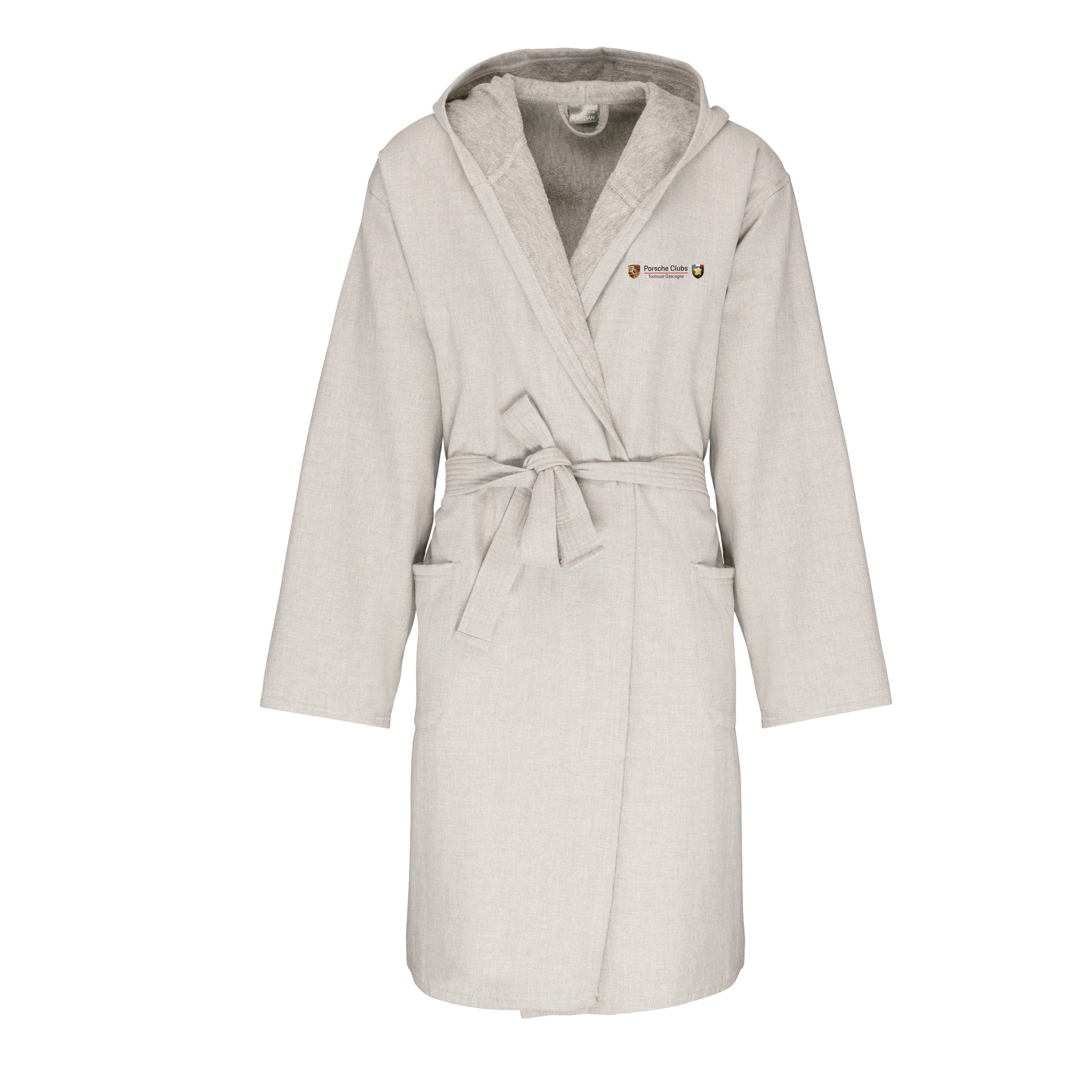 Coloris Linen Grey : 95% coton / 5% viscose. Maille Terry. Toucher agréable et doux. Grande capuche. 2 poches côté plaquées avec surpiqûre de renfort en haut de poches. Ceinture avec passants. Lien d’accrochage dans le col.